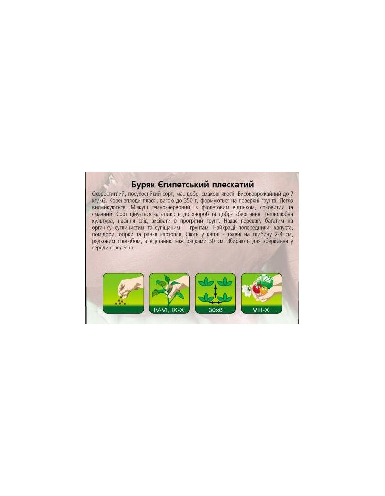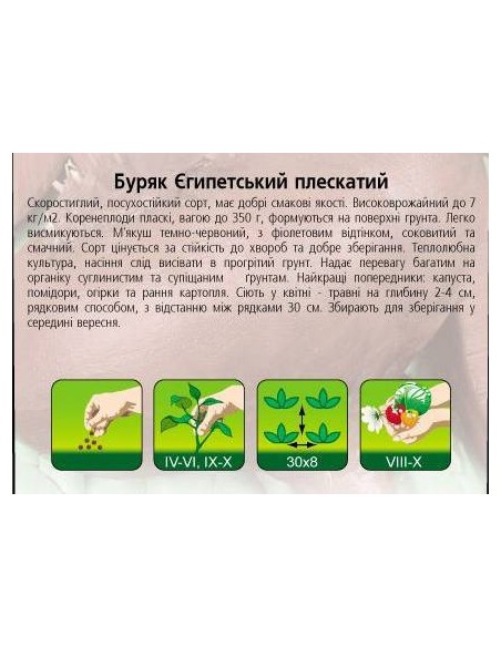 Скоростиглий, посухостійкий сорт, що володіє гарними смаковими якостями. Високоврожайний до 7 кг/м2. Коренеплоди пласкі, м'якоть темно-червона з фіолетовим відтінком, соковиті та смачні, масою до 350г, формуються на поверхні грунту. Легко висмикується з грунту. Сорт цінується за стійкість до хвороб та чудове зимове зберігання. Теплолюбна культура, насіння слід висівати в прогрітий грунт. Слід вирощувати на багатих органічними речовинами суглинних і супіщаних грунтах. Кращі попередники капуста, томати, огірки, рання картопля. Сіють в квітні-травні, на глибину 2-4 см, рядковим способом, з відстанню між рядами 30 см. Збирання для зберігання проводять в середині вересня.
