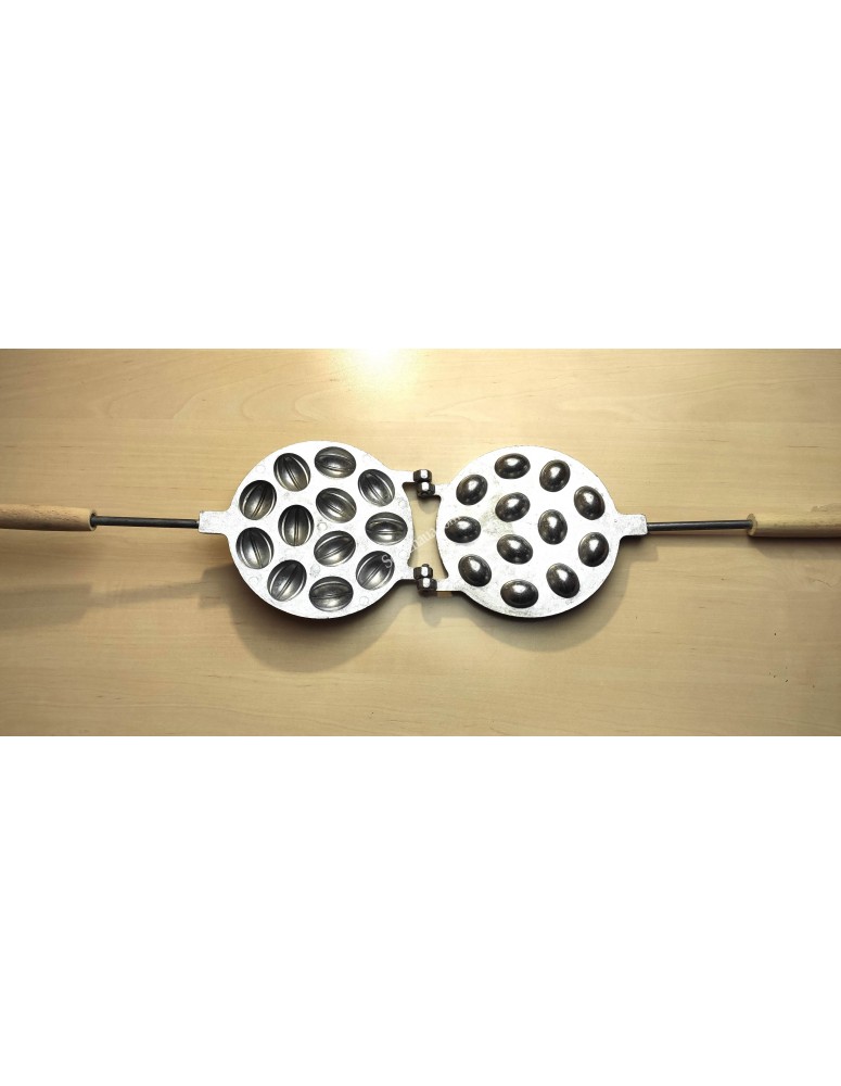 Форма для випічки Горішниця – форма для випічки горішків з начинкою зі згущеного молока з харчового алюмінію та дерев’яною ручкою. За допомогою форми можна створити одразу 12 половинок горішків.