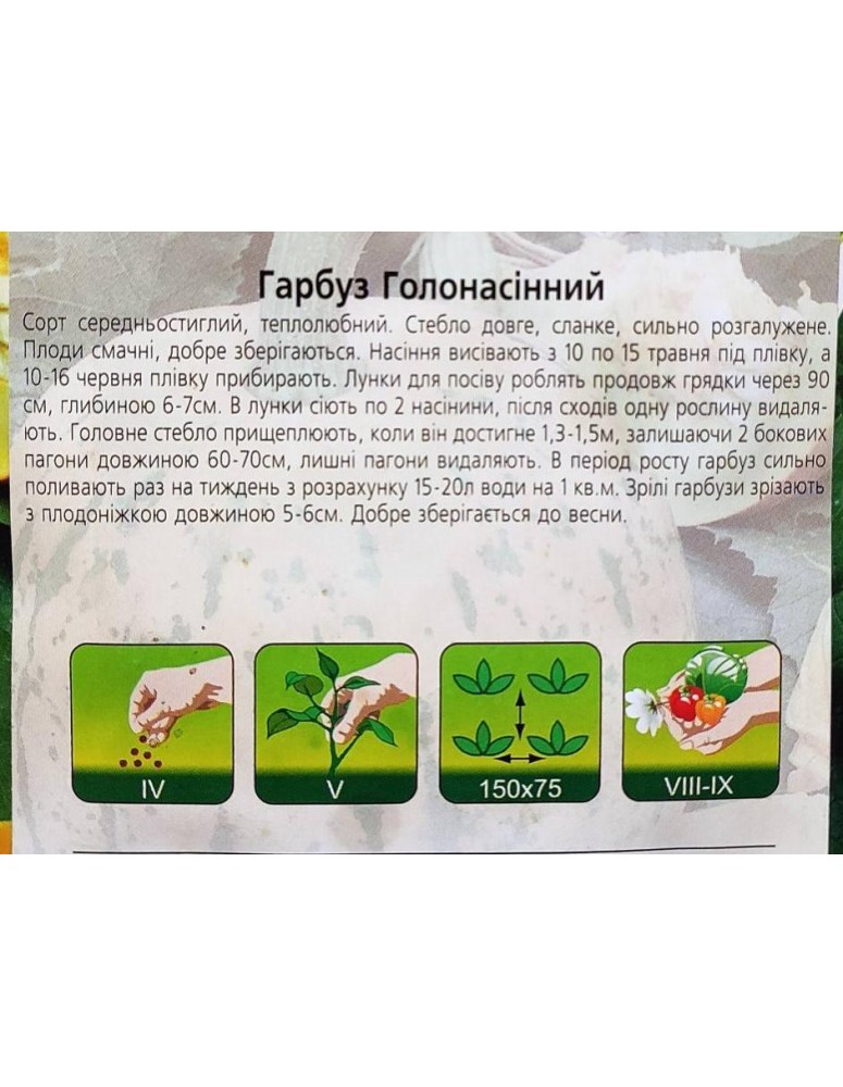 Головне стебло прищипують коли він досягає 1,3-1,5 м, залишаючи 2 бокових пагони довжиною 60-70см, зайві пагони видаляють. У період зростання гарбуз рясно поливають раз на тиждень з розрахунку 15-20л води на 1 кв.м. Дозрілі гарбуза зрізають з плодоніжкою завдовжки 5-6см. Добре зберігається до весни.