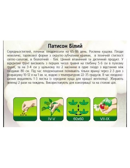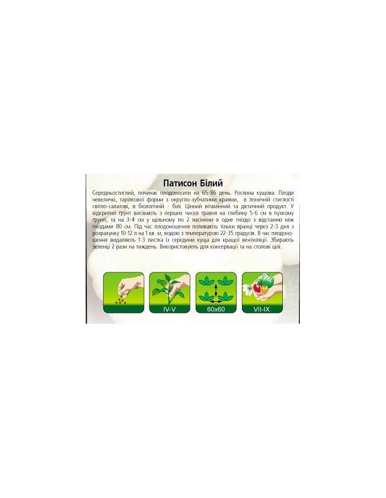 Середньостиглий, починає плодоносити на 65-86 день. Рослина кущової форми. Плоди дрібні, тарілкової форми з округло-зубчатими краями, в технічній стиглості світло-салатні в біологічній - білі. Цінний вітамінний і дієтичний продукт. У відкритий грунт висівають з перших днів травня на глибину 5-6 см в пухкому грунті, в щільному - на 3-4 см, по 2 насінини в одне гніздо з відстанню між гніздами 80 см. Під час плодоносіння поливають тільки вранці через 2-3 дні з розрахунку 10-12 л на 1 кв.м, водою з температурою 22-35 градусів. Під час плодоношення видаляють 1-3 листка із середини куща для кращої вентиляції. Зеленці збирають 2 рази на тиждень. Використовують для консервування та на столові цілі.