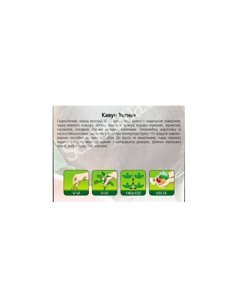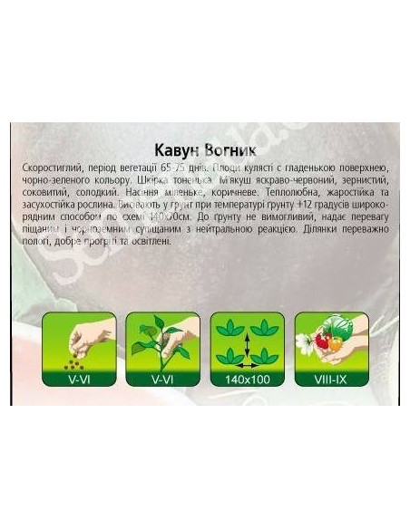 Скоростиглий, період вегетації 65-75 днів. Плоди кулясті з гладкою поверхнею, чорно-зеленого кольору. Кора тонка. М'якоть яскраво-червона, зерниста, соковита, солодка. Насіння дрібне, коричневе. Теплолюбна, жаростійка та засухостійка рослина. Висівають в грунт при температурі грунту +12 градусів широкорядним способом за схемою 140х70 см. До грунту не вимогливий, надає первагу піщаним і чорноземним супіщаним з нейтральною реакцією. Ділянки переважно пологі, добре прогріті та освітлені.