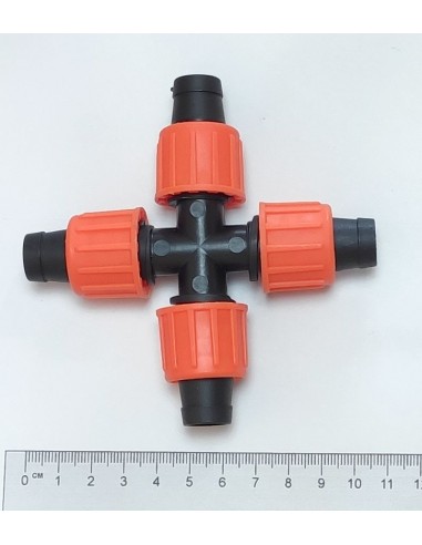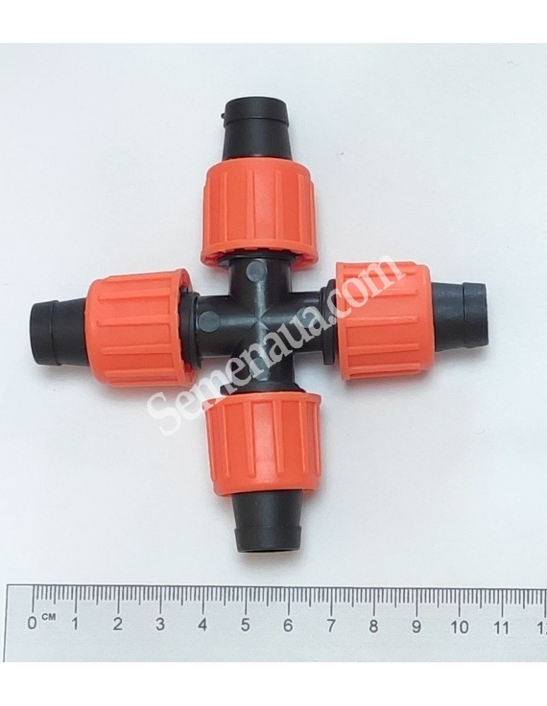 Крестовое з'єднання для крапельної стрічки на 4 виходи служить для розгалуження крапельної стрічки по ділянці на кілька рядків, під прямим кутом. З'єднання зажимное міцно фіксує крапельну стрічку з чотирьох сторін затискними гайками. Діаметр крапельної стрічки 16 - 17 мм.