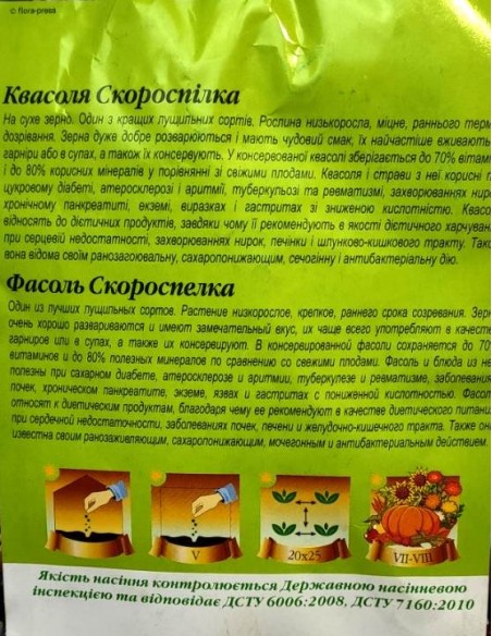 На сухе зерно. Один з кращих лущильних сортів. Рослина низькоросла, міцне, раннього терміну дозрівання. Зерна дуже добре розварюються і мають чудовий смак, їх найчастіше вживають як гарніри або в супах, а також їх консервують. У консервованої квасолі зберігається до 70% вітамінів і до 80% корисних мінералів у порівнянні зі свіжими плодами. Квасоля і страви з неї корисні при цукровому діабеті, атеросклерозі і аритмії, туберкульозі та ревматизмі, захворюваннях нирок, хронічному панкреатиті, екземі, виразках і гастритах зі зниженою кислотністю.Квасоля відносять до дієтичних продуктів, завдяки чому її рекомендують в якості дієтичного харчування при серцевій недостатності, захворюваннях нирок, печінки і шлунково-кишкового тракту. Також вона відома своїм ранозагоювальну, сахаропонижающим, сечогінну і антибактеріальну дію.