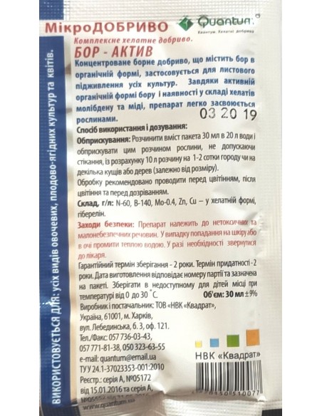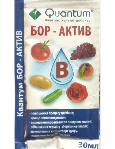 Квантум Бор-Актив - комплексное хелатное удобрение. Концентрированное борное удобрение, содержит бор в органической форме. Применяется для листовой подкормки культур, чувствительных к недостатку бора (рапс, свекла, подсолнечник, виноград, овощи и др.). Благодаря активной органической форме бора и наличия в его составе хелата молибдена и меди, препарат легко усваивается растениями.