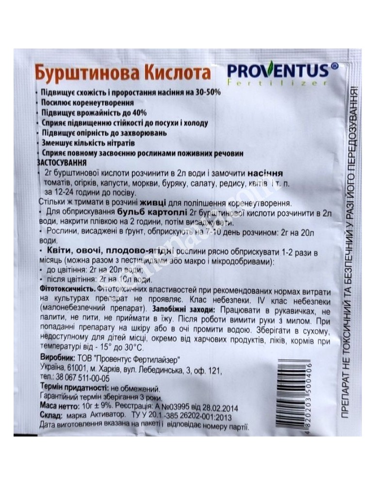 2 г Янтарной кислоты растворить в 2 л воды и замочить семена томатов, огурцов, капусты, моркови, свеклы, салата, редиса, цветов, и т.п. за 12-24 часа до посева. Столько же держать в растворе черенки для улучшения корнеобразования.