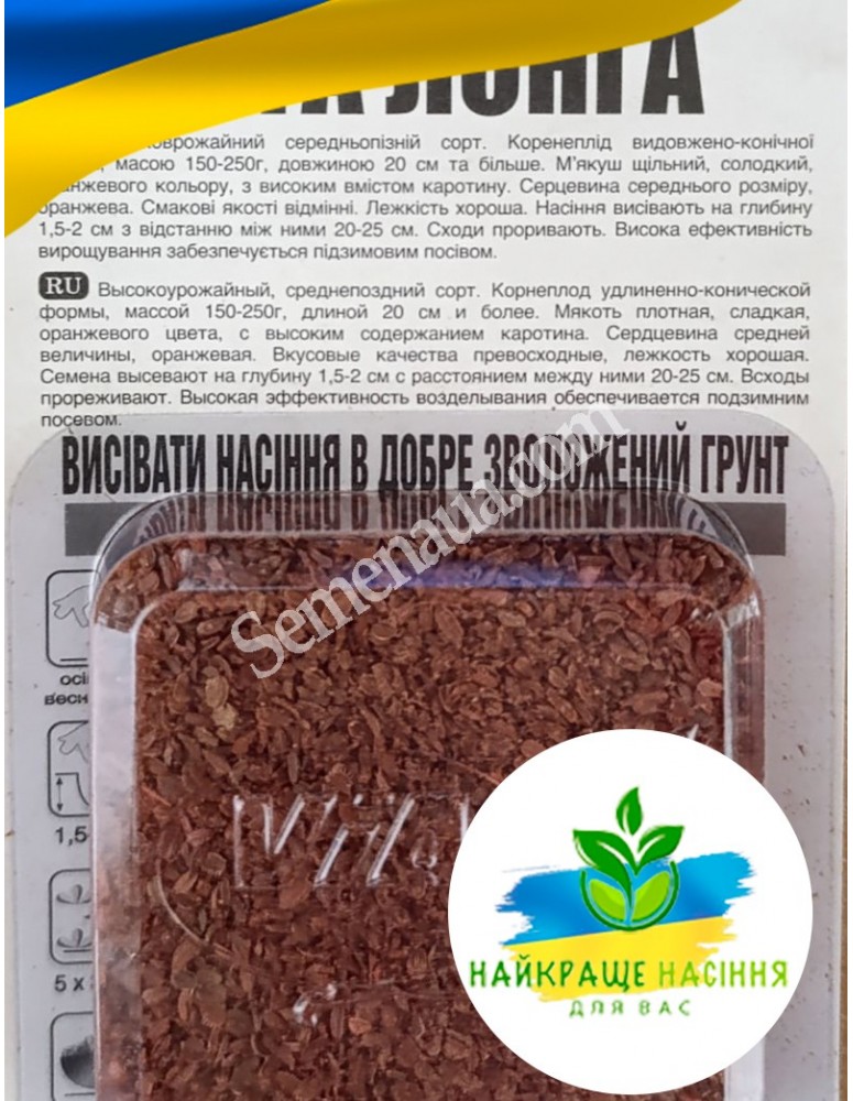 Високоврожайний середньопізній сорт. Коренеплід видовжено-конічної форми, масою 150-250г, довжиною 20 см та більше. М'якуш щільний, солодкий, оранжевого кольору, з високим вмістом каротину. Серцевина середнього розміру. оранжева. Смакові якості відмінні. Лежкість хороша. Насіння висівають на глибину 1,5-2 см з відстанню між ними 20-25 см. Сходи проривають. Висока ефективність вирощування забезпечується підзимовим посівом.