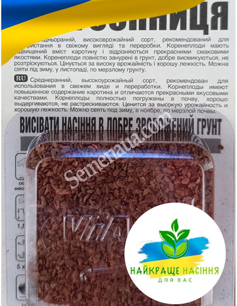 Середньоранній, високоврожайний сорт, рекомендований для використання в свіжому вигляді та переробки. Коренеплоди мають підвищений вміст каротину і відрізняються прекрасними смаковими якостями. Коренеплоди повністю занурені в грунт, добре висмикуються, не розтріскуються. Цінується за високу врожайність і хорошу лежкість. Можна сіяти під зиму, у листопаді, по мерзлому грунту.