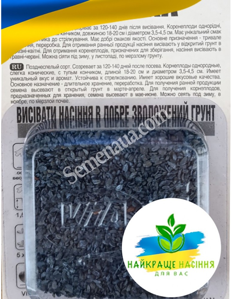 Пізньостиглий сорт. Дозріває за 120-140 днів після висівання. Коренеплоди однорідні, злегка конічні, з тупим кінчиком, довжиною 18-20 см і діаметром 3,5-4,5 см. Має унікальний смак та аромат. Стійка до стрілкування. Має добрі смакові якості. Основне призначення тривале зберігання, переробка. Для отримання ранньої продукції насіння висівають у відкритий грунт в березні-квітні. Для отримання коренеплодів, призначених для зберігання, насіння висівають в травні-червні. Можна сіяти під зиму, у листопаді, по мерзлому грунту.
