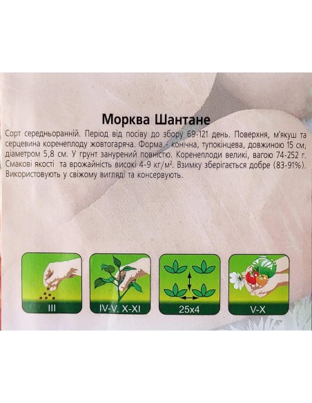Вдосконалений сорт типу Шантане середньопізнього терміну дозрівання. Дуже гладкі коренеплоди конічної форми. Насичений оранжевий колір. Популярний своєю високою врожайністю та відмінними смаковими якостями. Довжина коренеплоду 10-15 см, діаметр 3,5-5 см, вага 200-350 г. Призначений для споживання у свіжому вигляді, переробки і тривалого зберігання. Можна... Докладніше