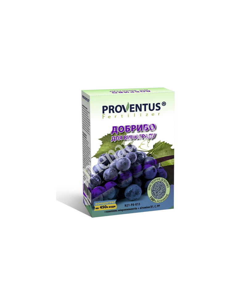Концентроване мінеральне добриво Proventus, збагачене комплексом макро- та мікроелементів у хелатній формі, застосовується для повноцінного підживлення винограду з метою збільшення вмісту поживних елементів у ягодах та стимулювання процесів росту, розвитку і врожайності культур. Збалансований склад добрива Провентус містить усі необхідні для живлення елементи в оптимальному співвідношенні та легкодоступній для рослин формі. Завдяки цьому засіб підвищує врожайність та вміст корисних компонентів у ягодах (вітамінів, фруктози, пектину та інших), зміцнює імунітет рослин та усуває видимі прояви дефіциту елементів живлення. Завдяки збалансованому складу добрива, рослина формує рівномірні грони більшого розміру. Крім цього, мінеральне підживлення Провентус знижує кількість нітратів у ягодах, підвищує родючість грунту і відмінно поєднується з органічними добривами.