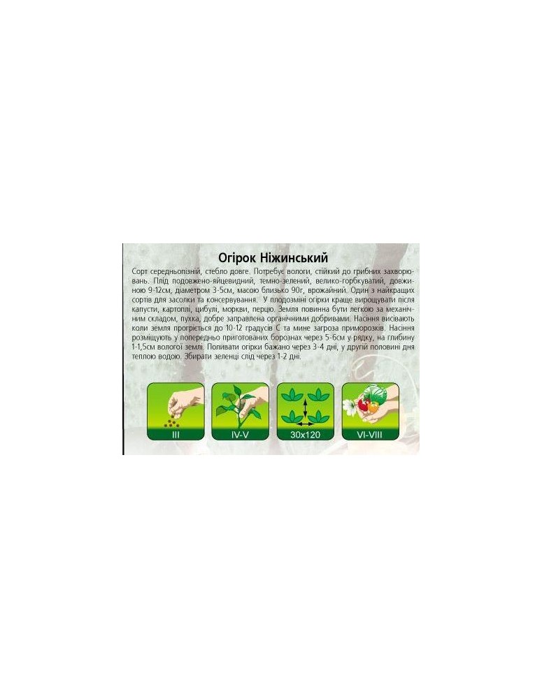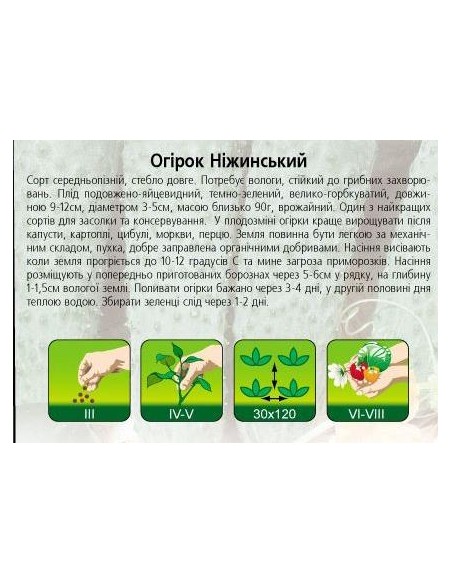 Сорт середньостиглий, стебло довге. Потребує вологи, стійкий до грибних захворювань. Плід подовжено-яйцевидної форми, темно-зелений, крупнобугорчатий, довжиною 9-12 см, діаметром 3-5 см, масою близько 90 г, урожайний. Один з кращих сортів для засолки та консервування. У плодозміні огірки краще вирощувати після капусти, картоплі, цибулі, моркви, перцю. Земля повинна бути легкою за механічним складом, пухка, добре заправлена органічними добривами. Насіння висівають в грунт коли грунт прогріється до 10-12 градусів і мине загроза заморозків. Насіння розміщують в попередньо зроблених борознах через 5-6 см в ряду, закладаючи їх на глибину 1-1,5 см вологої землі. Поливати огірки бажано через 3-4 дні, в другій половині дня теплою водою. Збирати зеленці слід через 1-2 дні.