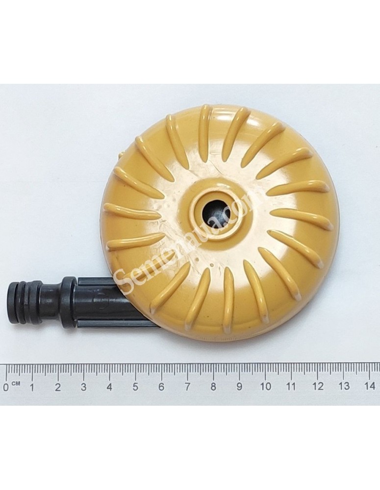 Розпилювач Равлик "МАКСІ" 13 см під коннектор, призначена для зрошення території в радіусі до 11 метрів в залежності від подачі тиску води. Штуцер, розташований на виробі, дозволяє приєднувати поливальні шланги різного діаметру 5/8 "(18 мм) - 3/4" (20 мм) і закріпити його металевим хомутом, відповідного діаметру