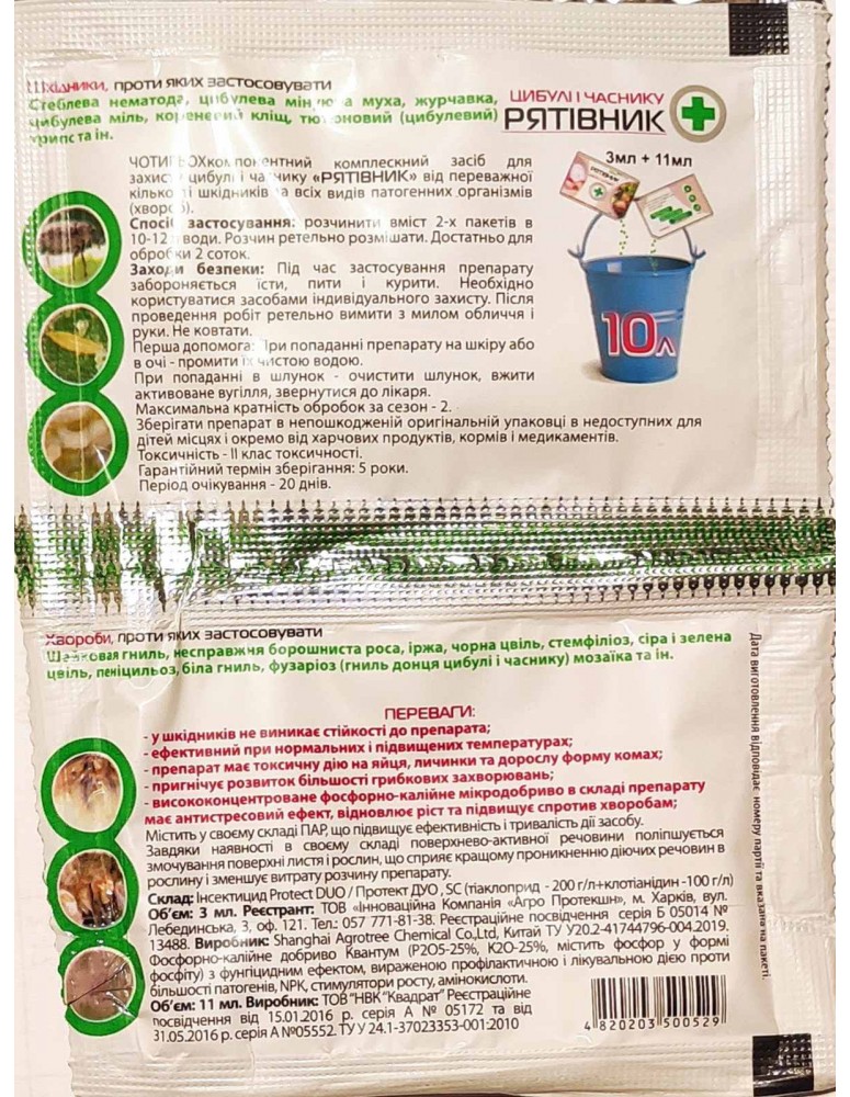 Норма витрати препарату: Розчинити вміст 2-х пакетів в 10 - 12 л води. Розчин ретельно розмішати і обробити 2 сотки землі.
