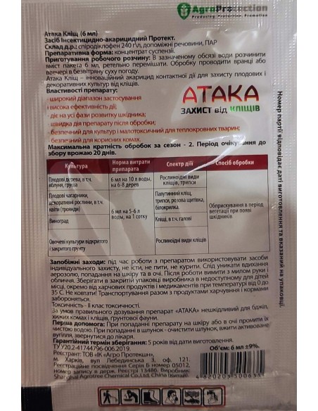 Інструкція, спосіб застосування, склад, дозування та норма витрати інсектоакарициду Атака кліщ 6 мл