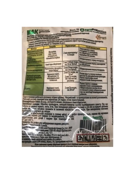Приготування робочого розчину: 4 мл препарату "МаК" розвести у двох літрах води. Витрата — 1 л/1 кг посадкового матеріалу.