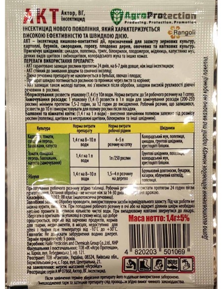 | Пшениця зима | 1,4 г на 5 л води на 1 сотку | Бавовна, шкідлива мушля, тлі, трипси, п'явиці | Обприскування в період вегетації |