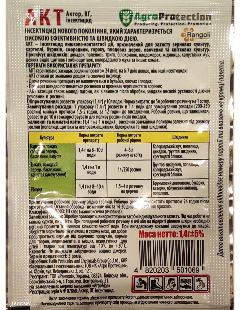 | Картопля | 1,4 г на 10 л води на 2 сотки | Колорадський жук, ти, дріт | Обприскування в період вегетації |