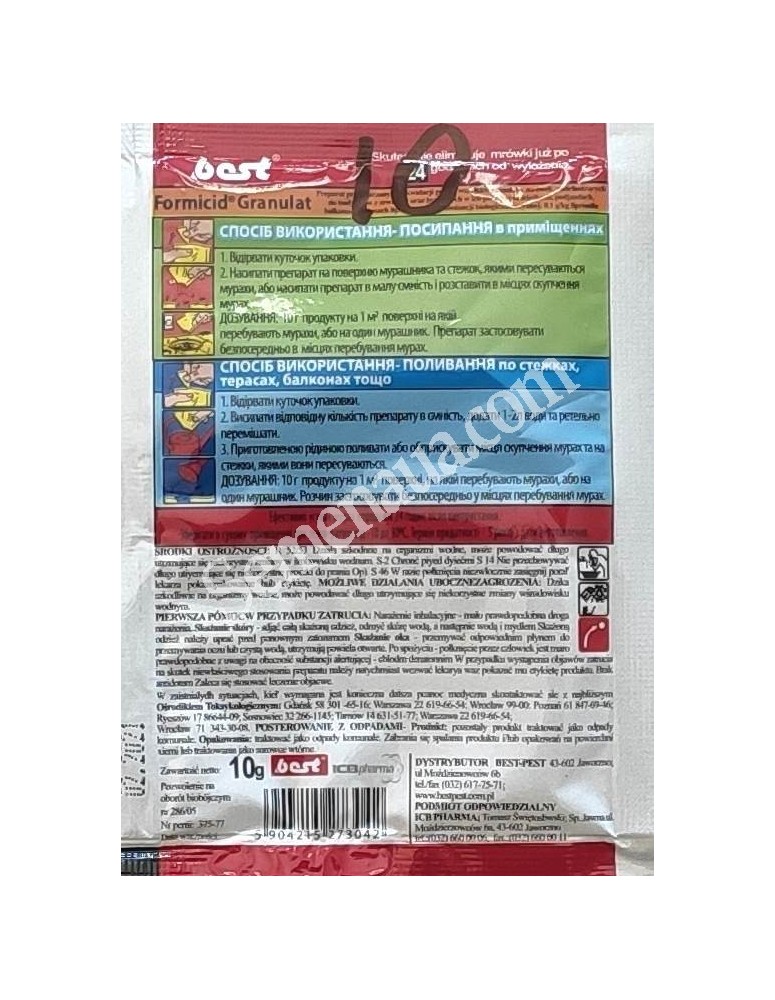 Спосіб застосування: гранули розсипають в місцях скупчення мурашок — навколо гнізд і на шляху їх пересування. Для полегшення подальшої прибирання, можна насипати приманку на підкладки (шматочки картону тощо) або у дрібні ємності (використані консервні кришки, наприклад зі слідами варення).