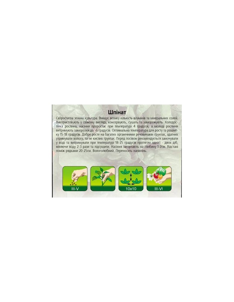Скоростигла зелена культура. Вміщує велику кількість вітамінів та мінеральних солей. Використовують у свіжмому вигляді, консервують, сушать та заморожують. Холодостійка рослина, насіння проростає при температурі 4 градуси, а молоді рослини витримують заморозки до -6 градусів. Оптимальна температура для росту та розвитку 15-18 градусів. Добре росте на багатих органічними речовинами грунтах, здатних утримувати вологу, та не кислих грунтах. Перед посівом рекомендується замочувати у воді і витримувати при температурі 18-25 градусів протягом однієї-двох діб, міняючи воду 2-3 рази і підсушити. Насіння загортають на глибину 1-2 см. Відстань між рядками 20-25 см. Вимогливий до вологи. Переносить напівтінь.